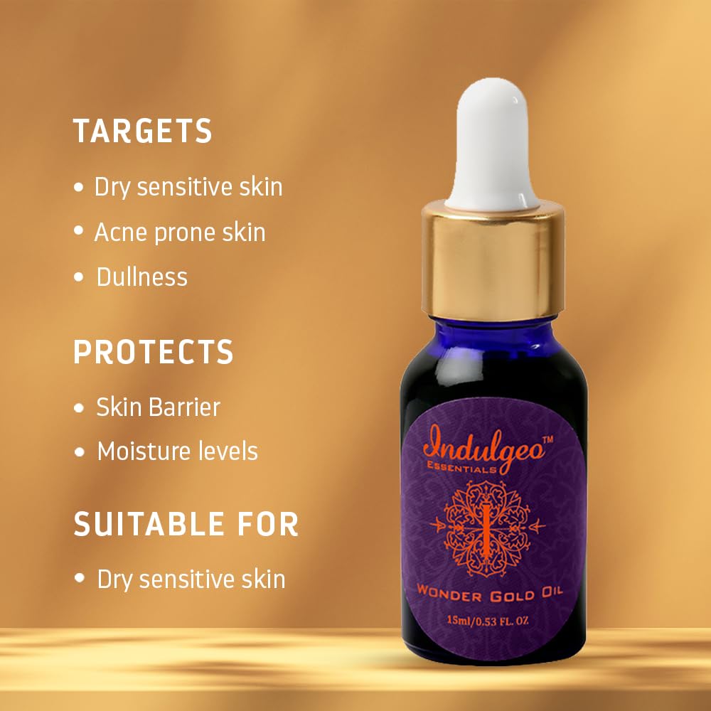 Indulgeo Essentials Wonder Gold Oil 15ml | 24K Gold Pre-Makeup Primer for Face | Primer for Oily & Dry Skin | Beauty Oil for Instant Glow with Natural SPF | Highlighter Makeup Effect | Face Oil for Glowing Skin | Helps Reduce Hyperpigmentation, Fine Lines & Aging | Ayush Certified